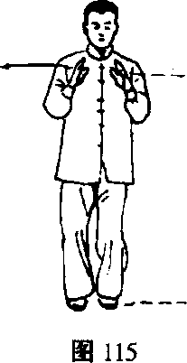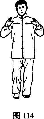①右脚向前上步,随即左脚跟至右脚后,脚尖着地,稍 停再向后撤步;同时重心移至左腿,右脚尖翘起;左手置于 右手腕一同前推(右手心向上,左手心向下),再向右、向 后平着划弧至右肩前,两手心均向外(图110~1⑵。②右脚尖落地,重心移至右腿并屈膝,随即左脚收至右图112 图113脚后约距10厘米处,脚尖着地;眼看右手(图113)。51. 开手动作与第3势“开手”相同(图114)052. 合手动作与第4势“合手”相同(图115)o