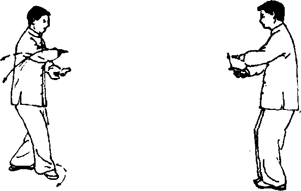 ① 右脚尖外摆,全脚掌着地,与左脚成“外八字”形; 同时左手外旋,右手内旋,屈臂在胸前上下相合,右手在 上,左手在下,手心相对相距约10厘米;眼看右手(图 145) □