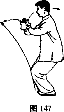 左脚跟落地踏实,身体重心移至左腿,左腿屈膝;右脚 跟提起,脚尖着地;同时右手向下、向胸前伸出;左手回收 至右肘内侧,两手指均向前,拇指侧向上,臂微屈;眼看右 手(图144) o