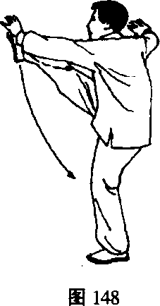 ③ 身体上起,重心全部移至左腿;同时右脚向前上方踢 出,脚面展平;左手在胸前迎拍右脚面,右手向下、向右划 弧成侧举,手腕高与肩平;眼看拍脚方向(图148)。