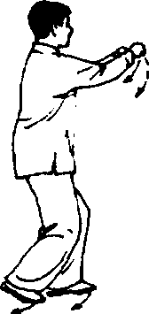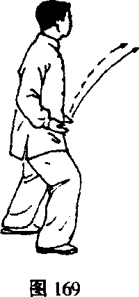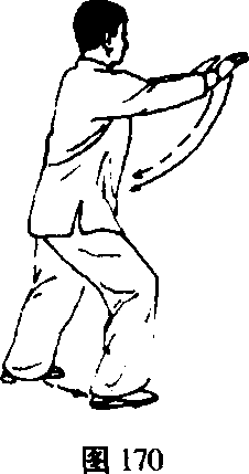 ①右脚向右前方(东南)落步,两手外旋收至两腰侧, 手心均向上;接着重心移向右腿;两手同时向前上(偏向东 北)伸出(在伸的过程中两手内旋),手心均向下,高与肩 平,两臂微屈;眼看两手之间(图169-170)o