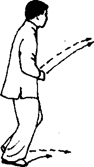 拳心向下;接着左脚向前(东北)上步,右脚跟步至左脚 后,脚尖外摆落地,约距10厘米,同时两拳向前撞击,拳 心向下,两臂微屈;眼看两拳(图171 ~ 172)。