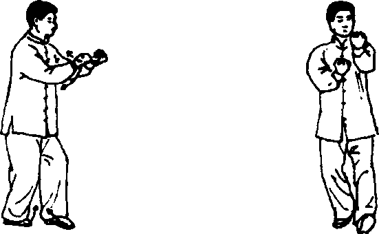 左脚收至右脚内侧,脚尖着地;两手变拳回收至腹前,