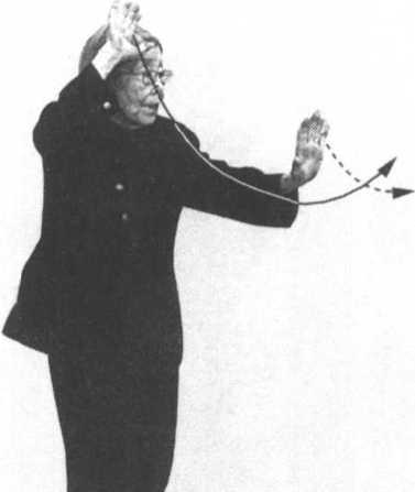 右足向右前方迈一步;左足随即跟步至右足 后相距10厘米。同时,右手内旋向上架于右额 上方;左手在胸前,轻轻向前推出(左肘贴肋), 臂微弯曲,手心向前,指尖向上。眼看左手(图 20 )0
