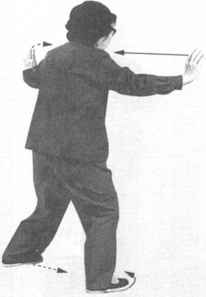 接前式,右手向右、向下、向前划弧经左手 腕下伸出,两腕交叉,并收至胸前约10厘米,右 手在外,左手在内,指尖均向上。同时,左足向 前迈一步,重心移向左腿;右足随即跟至左足后 约10厘米,足尖着地。眼看两手(图21)。