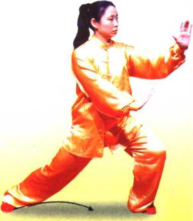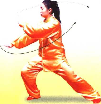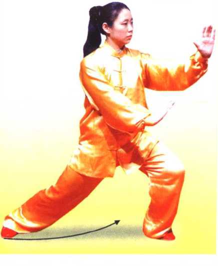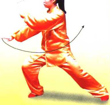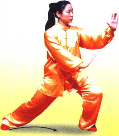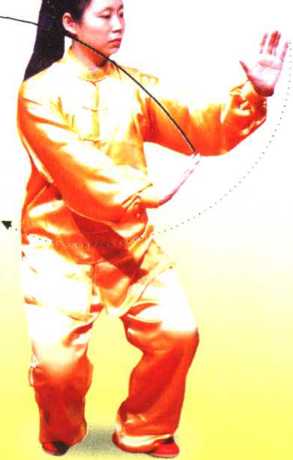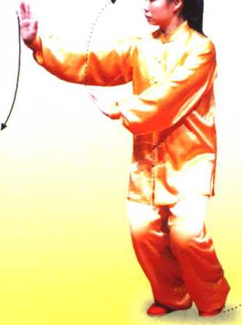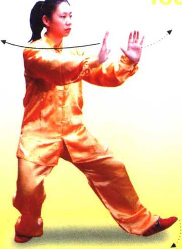 8 .身法不变,右腿弓住塌劲,提 起左脚向左开步,落地塌实,形成右 侧弓步;接着,身体左转,左腿弓膝 塌劲,身体重心左移,变成左侧弓 步;同时,左手向上转至肩高、逆缠 经面前向左,转至左侧前方,与肩同 高,掌心向左,掌指向上,右手向下 落至腹高,变顺缠,向内转至腹前, 掌心斜向下,掌指斜向左,眼看左前 方(佟1177、178)