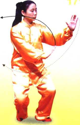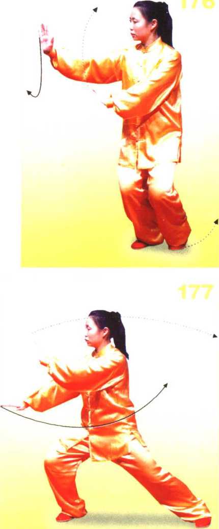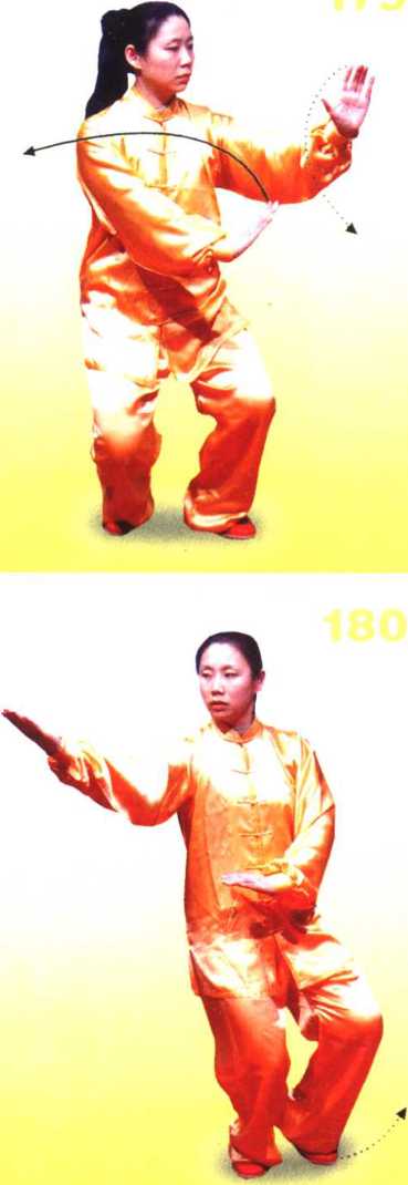 5 .身法不变,右腿弓住塌劲,提 起左脚向左开步,落地塌实,形成右 侧弓步;接着,身体左转,左腿弓膝 塌劲,身体重心左移,变成左侧弓 步;同时,左手向上转至肩高、逆缠 经面前向左,转至左侧前方,与肩同 局,掌心向左,掌指向上,右手向卜 落至腹高,变顺缠,向内转至腹前, 掌心斜向下,掌指斜向左,眼看左前 方(图173、174)。