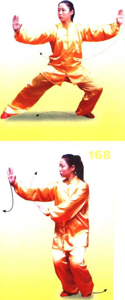 2 .身体右转,左脚尖落地踏实, 向前弓膝塌劲,右腿自然伸展,形成 左侧弓步;左手向左前方推出,掌心 斜向前,掌指向上,右手随转体向右 侧前方转出,掌心斜向前,掌指向 上,眼看右手(图167)。