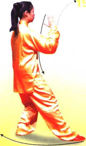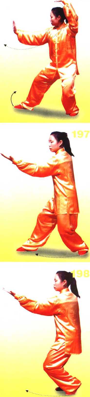 5 .身体上起立正,稍右转,右腿 弓住塌劲,提起左脚向前上步,落地 踏实,腿稍屈,形成左前虚步;同时 右手向前向上转至额前上方,掌心向 上,掌指斜向左,臂呈弧形,左手向 前推按,与胸同高,掌心向前,掌指 向上,眼看左手前方(图195)。