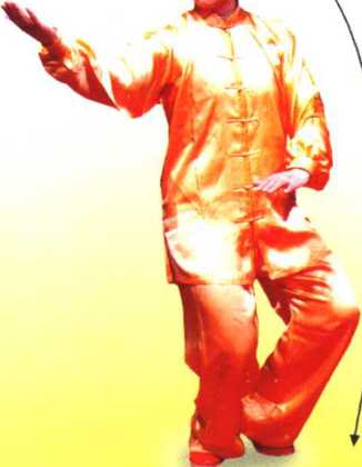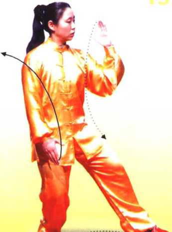 2 ??一.身体右转,左腿弓住塌劲,提 起右脚向后撤步,落地踏实,屈膝塌 劲,重心移至右腿,左腿稍屈,形成 左前虚步;同时左手抬起,屈臂向内 转至胸前,掌心向右,掌指向上,右 手向内向下转至右胯侧,掌心向内, 掌指向下,眼看前方(图192)。