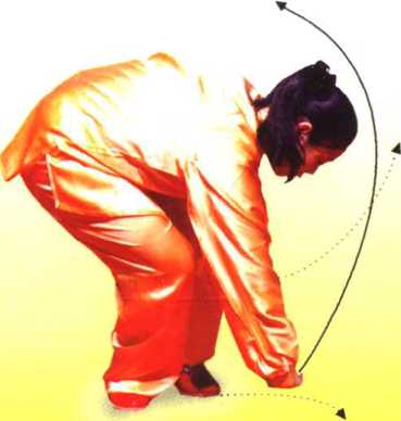 4 .紧接上势,动作不停。身体左 转井前倾,两腿屈膝下蹲;同时右手 向内转至额前上方"沿体前向卜,按转 至腓骨前,掌指向下,掌心向左,左 手向左搂转至左胯外侧,掌心向下, 掌指向前,眼看右手(图194)。