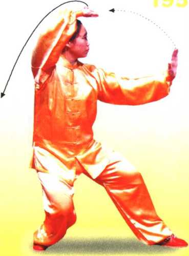 3 .身法不变,右腿弓住塌劲,提 起左脚向内收转落至右脚内侧,脚尖 着地,形成左丁步;同时右手顺缠向 右前上方转出,与肩同高,掌心向 上,掌指斜向右,左手向内向下按至 腹前,掌心向下,掌指斜向右,眼看 右手(图193)。