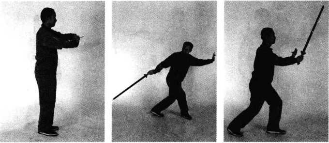 此动作重复两次。当左脚向前迈第三步后,右脚跟步与左脚并拢。左手 剑在左髓旁,右手剑指向前平伸出。眼随剑指平看(图7)。