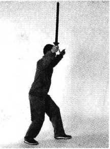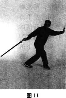 (2)左腿倒插步前脚掌落地。同时左手剑指向前伸出,右手沿身体右侧 由上向下劈剑,力达剑身,剑尖指向身体后下方,臂与剑成一直线。眼看剑 尖(图9)。