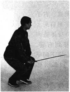 (1)两腿慢慢弯曲。左手持剑落在左髓旁,右手剑指翻为手心向上,向 下向右划弧,至身体右侧,右臂伸直与肩同高。眼看剑指(图3)。