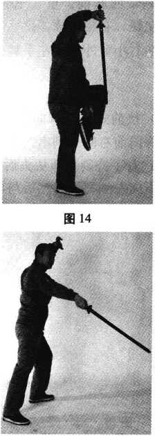 接前式。重心放在右腿上,起身 左腿提膝,剑尖垂直朝下倒提剑,前 臂外旋,虎口朝下,高与额头平,左 手剑指放于左小腿内侧(图14)。