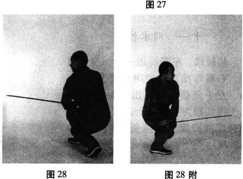 体外侧在胸前绕立圆,向下扑剑,剑刃横于小腹前,手背朝上,左手剑指扶 在右手腕处。眼向剑锋方向平看(图28、图28附)。