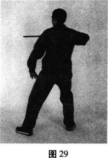 (1)接前式。右脚 向右侧迈一步,成右半 弓步。右手剑提把在胸 前由下向右上方绕环; 左手剑指从右腋下插过, 向下、向左侧与右手剑 相反方向在胸前绕环 (图 29)。