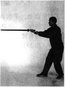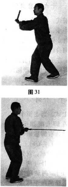 接前式。右脚向前垫步,左脚随 之向右脚后插步,脚掌着地,脚跟欠 起,两腿略弯曲。同时右手握剑向里 拧小臂,横过剑刃,手心朝下,左手 剑指扶于右小臂处。眼随剑锋平看 (图 31)。