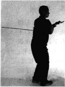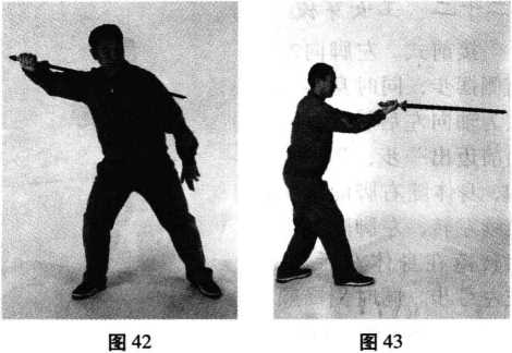 (1)接前式。右脚 向右侧迈一步,成右半 弓步。右手剑提把在胸 前由下向右上方绕环; 左手剑指从右腋下插过, 向下、向左侧与右手剑 相反方向在胸前绕环 (图 42)。