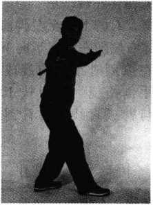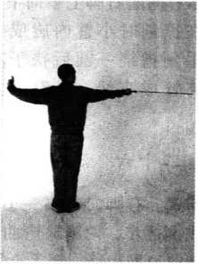 接前式。右脚向前进步,左脚随 之跟进半步,然后两脚不停,向左前 方顺时针走弧形线。同时右手持剑从 左腋下向身体右侧慢慢展开,翻为掌 心朝上;左手剑指向身体左侧慢慢展 开。两臂略低于肩,眼随剑(图34)。