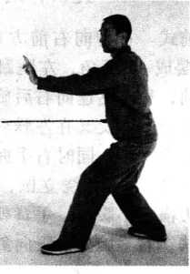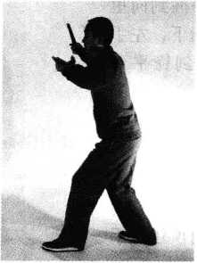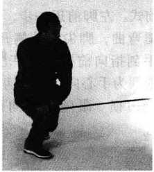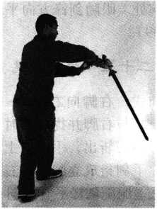 图41图41接前式。右脚向右前方迈半步, 脚尖外摆成45度角,左腿跳起,落 于右脚前,身体迅速向右后旋转,左 脚落地右脚顺势交叉在左腿后,两腿 弯曲成后交叉步。同时右手握剑从内 向身体外侧在胸前绕立圆,向下扑 剑,剑刃横于小腹前,手背朝上,左 手剑指扶在右手腕处。眼向剑锋方向 平看(图41)。(身体面向东)