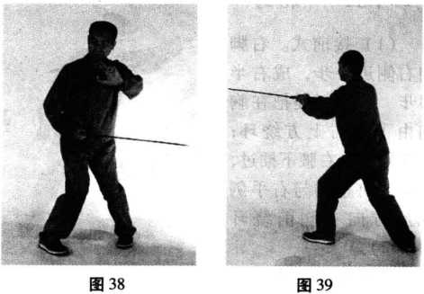 接前式。左脚向左 前侧摆步,同时身体以 腰为轴向左后转;右脚 向前迈出一步,脚尖内 扣,身体随右脚的落实 继续左转,左脚随身体 旋转落在身体左后方, 成左弓步。同时剑锋顺 左脚尖方向向前平刺出, 手心向上,左手剑指扶 在右手腕处。眼随剑锋方向平看(图 38、图39)。