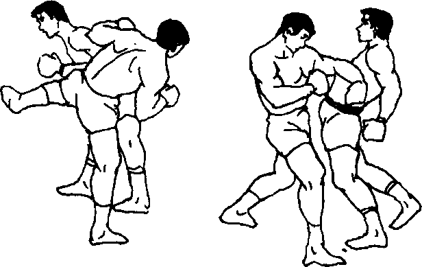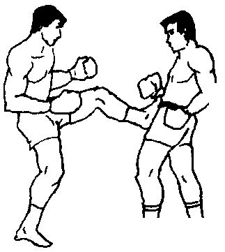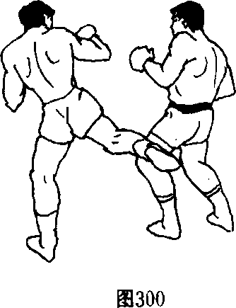 26 双人呈格斗式,甲左刺拳引诱乙方注意力,同时右脚 低扫踢(割踢)乙前腿肌肉或膝窝,右脚落地时即以左横撞膝 撞击乙胸腹部,再顺势以左摆肘横击其心窝附近部位(图 300、图301、图302)。或以左撬肘攻击乙腮帮、下腭。