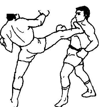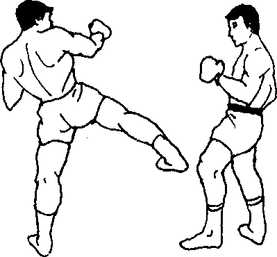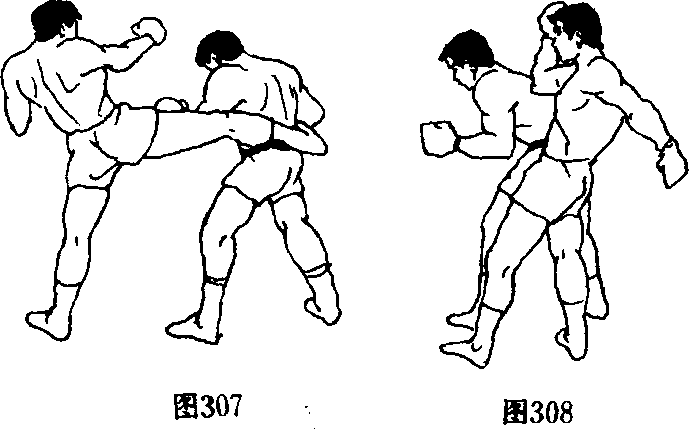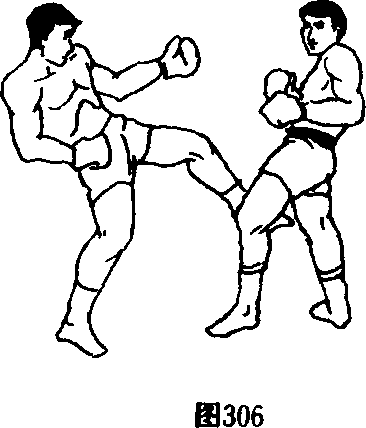 27.双人呈格斗式,甲在刺拳的配合下,右脚迅速低扫踢 (割踢)乙前腿肌肉或膝窝,如乙急退一步防,甲右脚落地时即 以左脚蹬踢乙胸腹部,再接左转身右脚侧踹踢其上身(图 303、图 304、图 305).