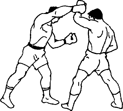 7 .双人呈格斗式,乙以左刺拳佯攻,右摆拳横击甲颈部 或腮帮时,甲即以左小臂向左上挑挡,随即上右步逼近乙方. 以右撬肘撬击乙下腭,并立即左后转身贴近,用左反肘猛击其