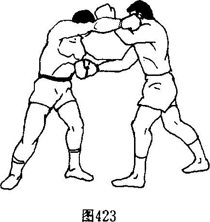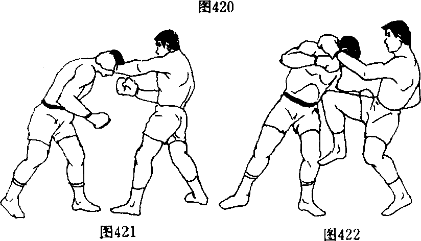 1 .双人呈格斗式,乙前垫步以左刺拳佯攻,右摆拳横击 甲太阳穴时,甲即以左臂向左上挑挡,随即左掌向乙右耳根部 或后脑猛击,并顺势下压其头部,以右上勾拳猛击乙面部,紧 接右上膝撞击其胸腹部(图420、图421、图422).