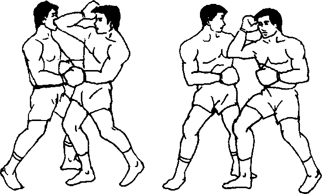 5 .双人呈格斗式,乙前垫步左刺拳虚晃,以右摆拳攻击 甲腮部时,甲即以左小臂向左上挑挡,同时身体左转右摆拳猛 击乙太阳穴,随即用左下勾拳勾击其腹或腰部(图430、图 431)。