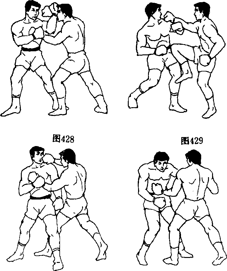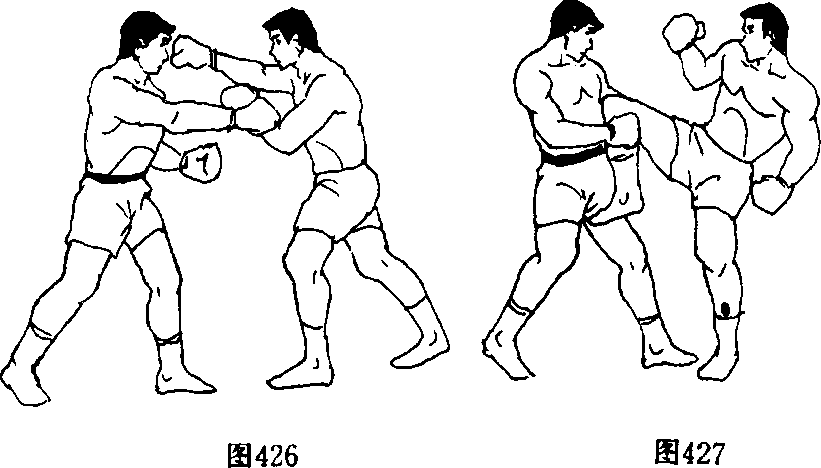 3 .双人呈格斗式,乙在刺拳等假动作的掩护下,用右摆 拳攻击甲头部左侧时,甲即以左小臂向左上挑挡,同时右直拳 猛击乙面部,随即左脚蹬地,身体上跃以右跪膝撞击其心脏附 近部位(图426、图427)。