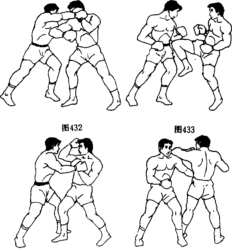 6 .双人呈格斗式,乙如突然间甲头部左侧发起攻击时. 甲即以左小臂向左上挑挡,同时上右步以右切肘猛切乙心窝 部位,随即用右短膝撞击其腰腹部(图432、图433)。
