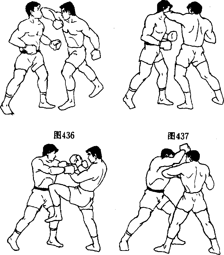 10 .双人呈格斗式,乙在刺拳等虚晃动作掩护卜,右摆拳 横击甲头部左侧时,甲即以左小臂向左上挑挡,同时右侧膝攻 击乙腹腰部,右脚落地同时,再以右摆肘打击其下颌或腮帮 (图 440、图 441)。