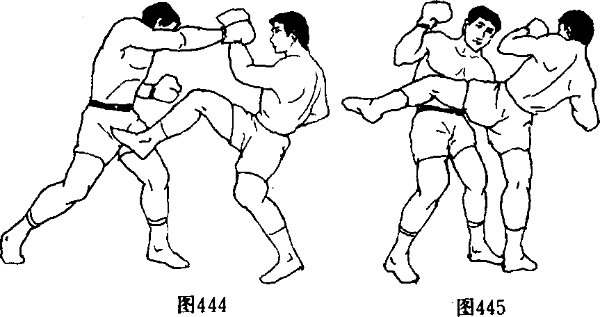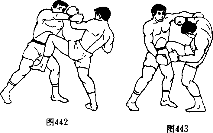 11 .双人呈格斗式,乙跨步向前突然以右摆拳横击甲太 阳穴时,甲即以左小臂向左上挑挡,同时以左前冲膝攻击其 胃、腹部,左膝下落时,可侧膝猛撞乙腰肋部(图442、图443)。