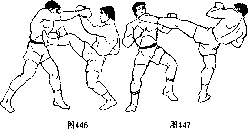 13 .双人呈格斗式,乙左脚跨步向前突然以右摆拳攻击 甲太阳穴时,甲即以左小臂向左上挑挡,同时以右脚正蹬踢乙 胸腹部,右脚落地时即用左脚侧踹踢其面部(图446、图447)。