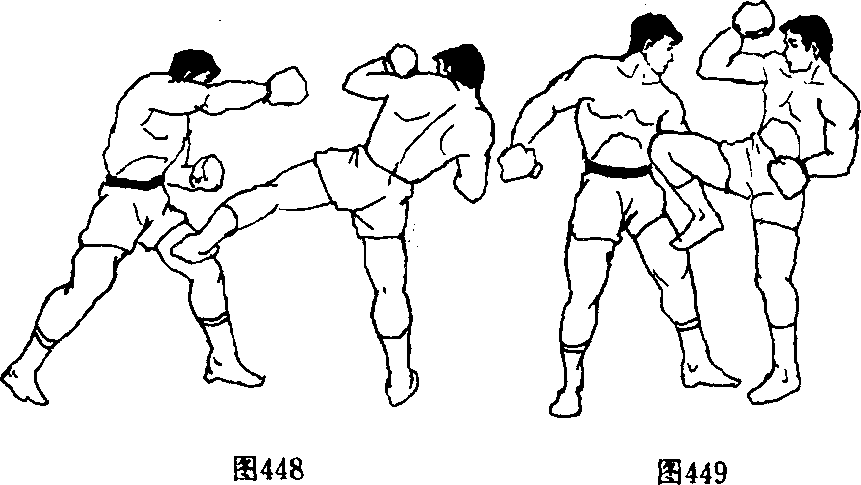 骨,左脚触地时,右侧膝撞击其腰肋部(图448、图449)