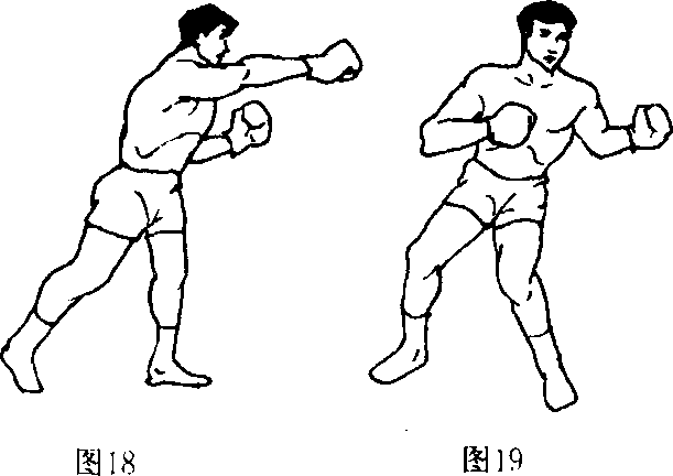 成左格斗式起,左臂前探,右拳后收,身体左转,右拳以蹬 腿、扭腰、送胯之合力,由后向前上屈臂猛击。击打目标是对方 下腭、肋、腹部位。左勾拳动作相反(图19)。