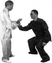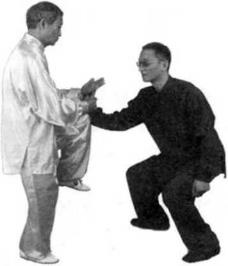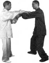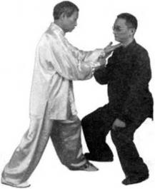 如他乂强行坠肘乂以右拳向我胸部打来我便改变手法,先用右手叼住他的右腕向下撅压左手从我胁旁旋转一周反贴在我的右手掌上,左膝提起顶紧我的右手,沉裆上步左掌升起,以中指刺他的喉头。