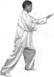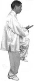 左掌同时向上伸展五指斜上,于项高。重心同时移向左腿(图552)(图552)