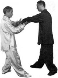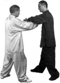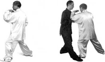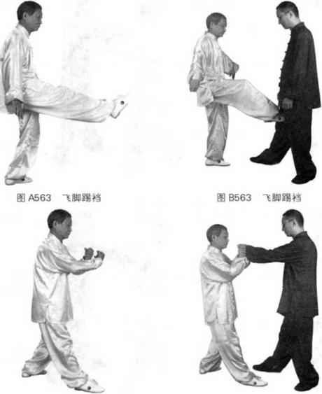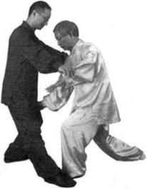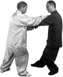 在他头仰胸突之际我沉裆迈出左步左掌搭肩坠肘击他的胸部。对手如右臂上搠,我左手反搂他的膝盖右手用转捶挑他的裆部。