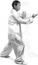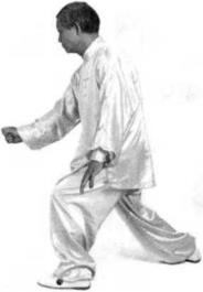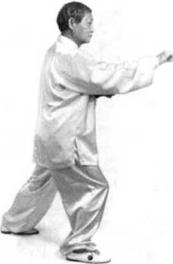 腰顺时针旋转一圈左肘顺时针旋转一立圆重心向左腿转移,成弓步。腰微左转左掌从上向下向左胯侧弧行移动,掌心初后,虎口朝下。同时右拳食指突出向前伸展拳心朝左虎口朝上,再坐腕拳与裆平。(图562)(图562)