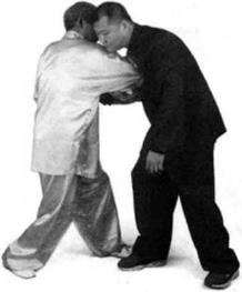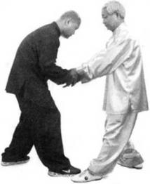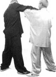 如他强行坠肘,我双臂绕转乂换右肘点他左胸上面的中府穴位。如他抽身想走我即以右手拿住他的右腕反举起来使他身子上浮脚跟离地。此时我左手转膀转腕,进行导气,先拍后腰,后向他胁部抓打以上提之劲将他打走。