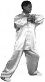 腰顺时针旋转一圈,身向右转,重心向右腿转移两掌相贴在胸前画一立圆,使两小臂成一立线横于胸前两掌手指相反右掌掌心朝前,虎口朝下。左脚同时前进半步。(图301)(图301)