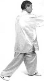 腰向右转,右掌从左掌背穿出再坠肘,右掌向额头前方弧行移动掌心朝前虎口朝左。左掌同时向左腰前方弧行掌心朝左五指朝前。同时重心向左腿转移成弓步。(图303)(图33)