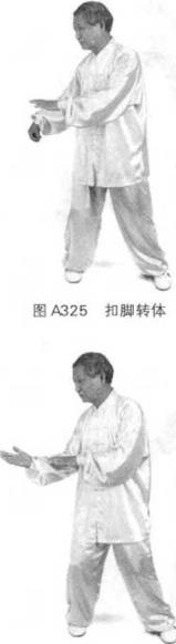 接前式重心移向右腿坐实,腰向右转,左脚尖内扣90度身体随腰转向南方。左掌从左向右腰侧前方伸出手心向后虎口朝上。腰顺时针旋转一圈左学在原处旋转使手心向下,虎口朝右。(图325)(图325)