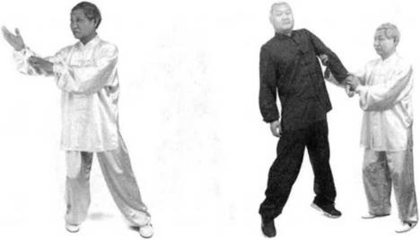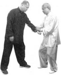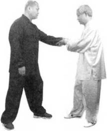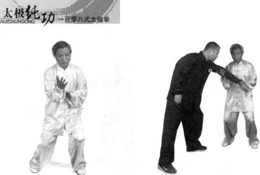 我身后右方又有一人用左宜拳向我右胁打来我即身向后坐,扣脚转体叼住对方的左腕转动我的胸肌将对方的左臂卷得手心朝上,向左回带。然后右臂反靠他的左肘,旋转我的右手将对方的曲池穴抓住将他左臂牵百举起他的左臂,将他向我右前方抛出。