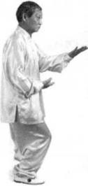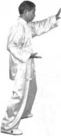 接着重心右腿坐实,腰向右转身体转向偏右方,左脚尖向里回扣30度左掌向右移至右膝上方左脚尖点地,脚跟初外摆。重心不变,腰微左转,而向南方。左脚尖点地脚跟朝里回收,左腿提膝朝右肩峰所指方向迈开一步。左掌同时直线上升到胸部前方手心朝上。(图390