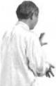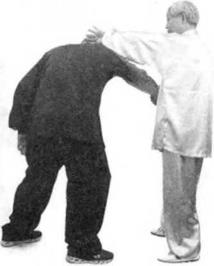 身向后坐重心移向右腿。左肘坠肘向收至腰际左掌也随之从上到下,从外向里弧行移动,向右掌靠拢左时距右掌约一拳手心朝卜右手中指对着左肘中部。(图389)(图389)